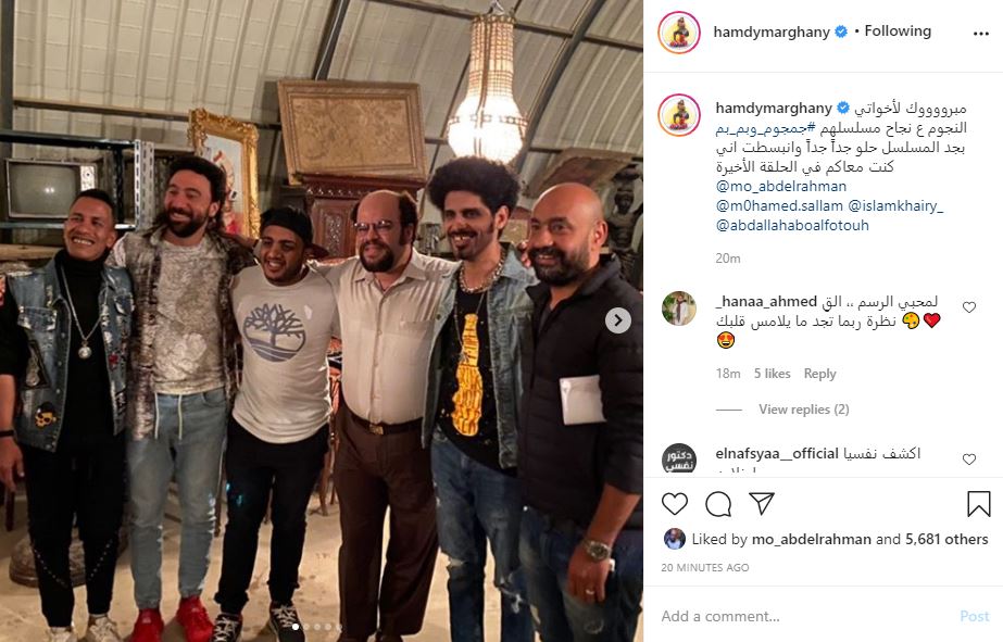 هنأ الفنان حمدى الميرغنى صديقه الفنان محمد عبد الرحمن "توتا" على مسلسله الجديد "جمجوم و بم بم" والظهور معه فى الحلقة الأخيرة. ونشر حمدى صور من كواليس التصوير عبر حسابه على إنستجرام، وكتب عليها قائلا: "مبروك لأخواتي النجوم على نجاح مسلسلهم جمجوم وبم بم بجد المسلسل حلو جداً جداً وانبسطت اني كنت معاكم في الحلقة الأخيرة". ووجه الفنان محمد عبد الرحمن "توتا" رسالة شكر للفنان أوس أوس والنجمة هلا السعيد، بعد ظهورهما كضيوف شرف فى مسلسل "جمجوم وبم بم"، الذى يعرض حاليًا على إحدى المنصات الرقمية العربية ونشر محمد عبد الرحمن صورة من كواليس المسلسل عبر حسابه على موقع التواصل الاجتماعى إنستجرام، معلقاً عليها: "أخويا النجم أوس أوس نورتنا وشرفتنا فى مسلسل (جمجوم وبم بم) من أجمل الحلقات، والنجمة هلا السعيد نورتينا وشرفتينا". مسلسل "جمجوم وبم بم - الشركة الألمانية لمكافحة الخوارق" من نوعية أعمال الـ15 حلقة، وهو تأليف مصطفى صقر ومحمد عز وكريم يوسف وإبراهيم خطاب، وإخراج إسلام خيرى، وبطولة محمد عبد الرحمن ومحمد سلام وميرنا جميل، محمد محمود وعدد من ضيوف الشرف مثل أحمد السعدنى، أحمد فتحى، شيماء سيف، محمد ثروت، عمرو وهبة وآخرين. وانتهى الفنان محمد عبد الرحمن من تصوير دوره في فيلم "مش أنا" للنجم تامر حسنى، حيث يظهر كضيف شرف خلال أحداث العمل، المقرر أن يطرحه فى دور العرض السينمائى الفترة المقبلة. وفى سياق آخر، ينتظر محمد عبد الرحمن استئناف تصوير فيلم "الخطة العامية" بجانب صديقه على ربيع، وتأليف أحمد عبد الوهاب وكريم كنز وإخراج معتز التونى، ويشارك في بطولته غادة عادل وعمرو عبد الجليل وعدد من ضيوف الشرف مثل الفنان شريف رمزى، حيث يتبقى أسبوع على انتهاء التصوير.