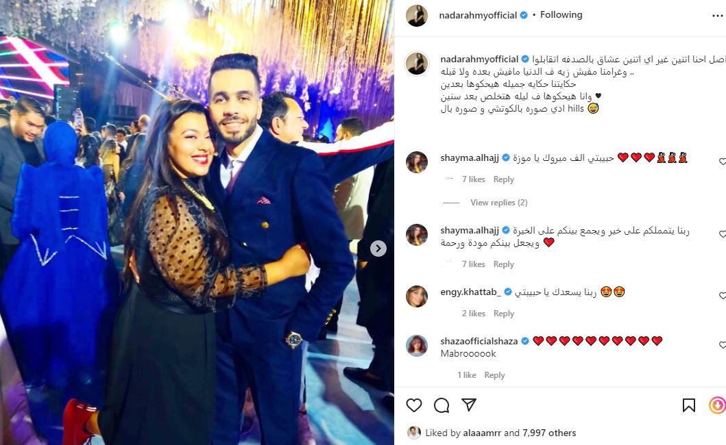 أعلنت الفنانة الشابة والإعلامية ندي رحمي عن خطوبتها بصور لها عبر خاصية ستوري بحسابها بموقع "انستجرام"، علي أنغام أغنية "يا دبلة الخطوبة"، كما نشرت صور مع خطيبها من حفل زفاف البلوجر علي غزلان، مصحوبة بتعليق:"اصل احنا اتنين غير اي اتنين عشاق بالصدفه اتقابلوا وغرامنا مفيش زيه ف الدنيا مافيش بعده ولا قبله ..حكايتنا حكايه جميله هيحكوها بعدين". كما عبرت عن سعادتها بتهنئة متابعيها وجمهورها لها، قائلة :"جالي كمية ماسيدجات كتير بطريقه مرعبه ناس بتباركي علي خطوبتي .. حقيقي ماتصورتش ابدا ان الناس هتبقي فرحنالي كده .. مش عارفه ازاي هقدر ارد علي كل الناس الحلوه دي". وتابعت :"بس يهمني انكوا تعرفوا ان انتوا الفرحة الحقيقية وفرحكوا بيا بالدنيا واللي فيها .. ربنا يخليكوا ليا يارب.. الف الف شكر حقيقي انا ممتنة وسعيده ومتشكره لكل حد اهتم يفرحني ويباركلي..اللهم صلي و سلم وبارك علي سدنا النبي وعلي آله وصاحبه وسلم اجمعين ". View this post on Instagram A post shared by Nada Rahmy (@nadarahmyofficial) وكانت كشفت الفنانة ندى رحمى، أنها تجهز لمسلسل "دليلك الذكى للطلاق"، وتقدم شخصية اسمها "نادية"، ومن المقرر أن يتم الانتهاء منه خلال الفترة المقبلة. وقالت ندى رحمى، خلال حوارها ببرنامج "الستات مايعرفوش يكدبوا" إنها قبل فقدان الوزان لم تكن تركز فى المظهر، وكانت مخطوبة ولكن لم يكلل الأمر بالنجاح وكان يرفض أن تُجرى عملية تخسيس، ولكنهما انفصلا لظروف شخصية أخرى. تابعت الفنانة أنها ارتبطت حينها بعمر 25 سنة وهو عمر صغير بالنسبة لها، وكانت تريد الزواج وتكوين أسرة، ولكن الآن هناك عمل وحياة تريد التركيز فيها، مشيرةً إلى أن وزنها كان 192 كيلو وقررت أن تخس للحفاظ على صحتها. وأضافت ندى رحمى، أن الأمر تطلب تدخل جراحى لأن الوزن كبير وأكثر من 100 كيلو يجب أن تخسرها، متابعة أنها لم يحصل لها أمراض مزمنة بسبب وزنها وهذا كان من ستر الله تعالى عليها، ولكنها كانت تعاني من ألم فقرات الظهر وتتعرق بشدة من مجرد جلوسها.